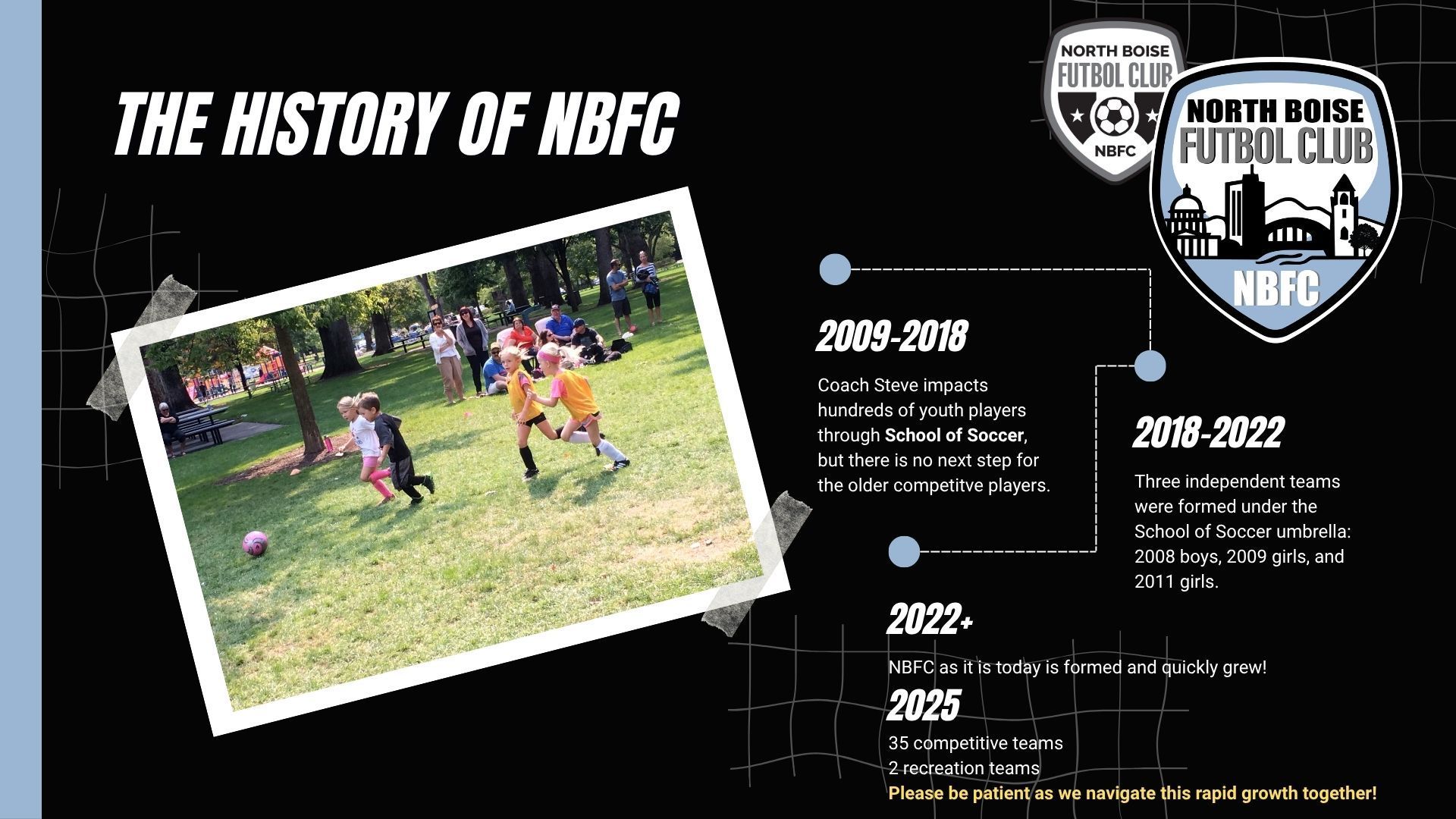 A medida que los niños crecían, Steve reconoció la necesidad de que su programa evolucionara a la par. Esta constatación dio origen al North Boise Futbol Club. Stacey Hopstad tenía dos hijas en el programa para niños pequeños del entrenador Steve, y cuando llegó el momento de que pasaran al fútbol competitivo, optó por evitar el ambiente de los grandes clubes de Boise. En cambio, decidió entrenar al equipo de sus hijas bajo la guía de la Escuela de Fútbol, manteniendo así su independencia. Su equipo, junto con el equipo masculino Galacticos, ha demostrado que los jugadores pueden alcanzar el éxito sin formar parte de un club masivo. El NBFC busca brindar una experiencia de juego competitiva para los niños a medida que crecen, sin dejar de lado los valores fundamentales inspirados por el programa de la Escuela de Fútbol.